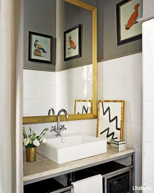 Иногда достаточно одной или нескольких картин, чтобы полностью преобразить помещение. Картины с птицами на верхнем фото, добавили ванной комнате ярких цветовых пятен.
