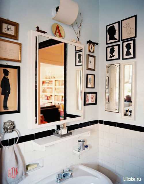 Интерьер этой комнаты украшен картинами с силуэтами и длинными зеркалами. Картины в сочетании с зеркалами — отличный вариант для ванной.