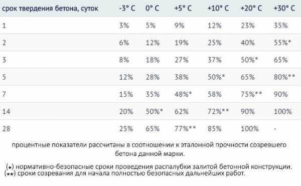 В таблице указаны сроки созревания бетона при разных температурных показателях (прочность раствора М 200 – М 300, произведенного на основе ПЦ М 400).