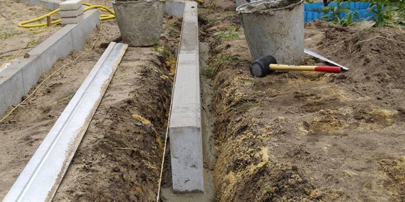Важно! Перед тем, как засыпать строительный материал в основание, в первую необходимо установить бордюр, который будет выступать в качестве барьера между бетонными брусками и землей.