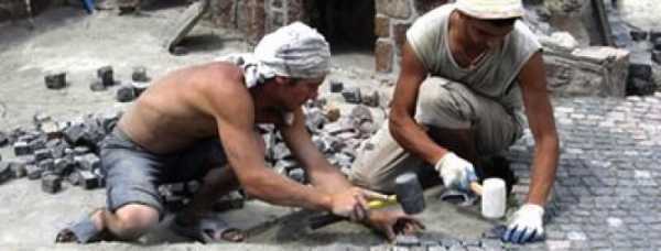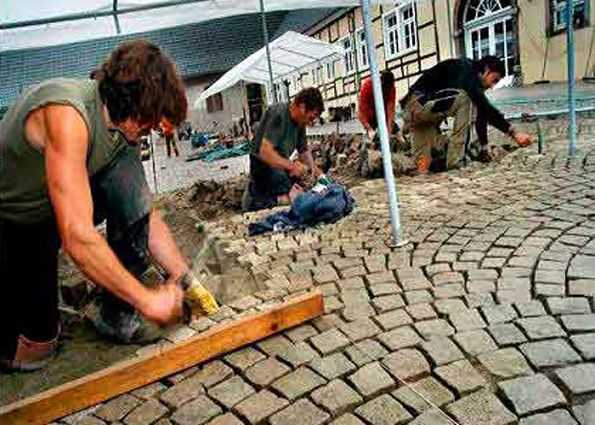 - Устройство брусчатки. Работы начинаются с угла конструкции с использованием уровня и рулетки. После укладки одного элемента вдоль первого ряда натягивается контрольная нить. Все последующие элементы укладываются в соответствии с направляющей нитью. При помощи резинового молотка и деревянной киянки элементы стыкуются друг с другом. После укладки первого ряда переходят на укладку второго элемента, повторяя всю процедуру заново. При этом обязательно выдерживать уровень продольной поверхности и поперечного уклона.