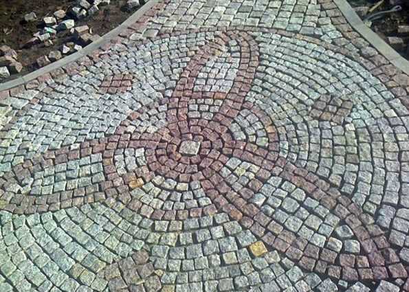 Бордюр — не только украшение, но и способ закрепить брусчаткуЕсли брусчатка укладывается на песок, его предварительно поливают водой. Для того чтобы задуманный рисунок при укладке брусчатки не сместился, применяются различные ориентиры. Можно натянуть капроновые нити или сделать специальный деревянный короб размером 1х0,7 м. Брусчатку укладывают плотно, сильно вдавливая в песок. Рисунок мозаики лучше разработать заранее, чтобы в процессе мощения не возникало лишних вопросов. После окончания укладки на дорожку наносят слой влажного песка и затирают его щеткой с жестким ворсом.