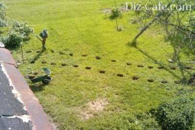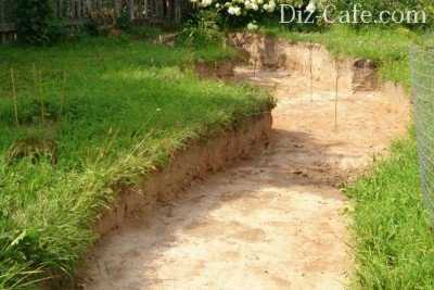 После я прикладывал к шлангу ровную рейку и лопатой размечал вторую сторону дорожки. Потом «выгрызал» лопатой по обеим сторонам дорожки кусочки дерна кубиками, они служили ориентиром при дальнейшем выкапывании траншеи.
