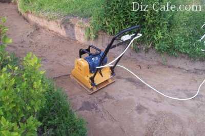 Но выровнять – недостаточно, по окончании слой должен быть максимально уплотнен, утрамбован. Для этой работы мне пришлось покупать инструмент – электрическую виброплиту TSS-VP90E. Вначале я пытался трамбовать еще не выровненный песочный слой, так как посчитал, что плита тяжелая и плоская – сама все выровняет. Но оказалось не так. Виброплита постоянно норовила застопориться в подъемах и спусках песка, ее приходилось отставлять, отодвигать. А вот когда песок был выровнен моей модифицированной мотыгой, работа пошла легче. Не встречая препятствий, виброплита двигается легко, как по маслу.