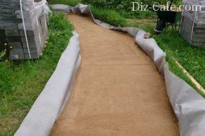 Укладка геотекстиляЕсли грунт под дорожкой плотный, на геотекстиль укладывают слой песка (толщина 10-20 см), разравнивают, поливают водой и утрамбовывают. На песок укладывают гравий толщиной 12-15 см, его тоже нужно разровнять и утрамбовать. Если же грунт рыхлый — сначала укладывают гравий, а на него песок. Если дорожка имеет сложный рельеф или перепады высоты, гравийную подушку лучше забетонировать тонким слоем цементного раствора.