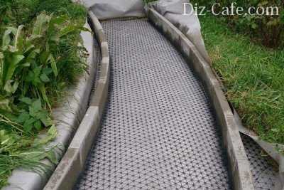 Вырезал куски геосетки и выложил их на дно траншеи. У меня — сетка Tensar Triax, с треугольными ячейками. Такие ячейки хороши тем, что устойчивы во всех направлениях, выдерживают усилия, приложенные вдоль, поперек и по диагонали. Если дорожки прямые, то нет проблем, можно использовать и обычные сетки с квадратными ячейками. Они устойчивы по длине и поперек, а по диагонали растягиваются. Мне, с моими дорожками, такие не подходят.