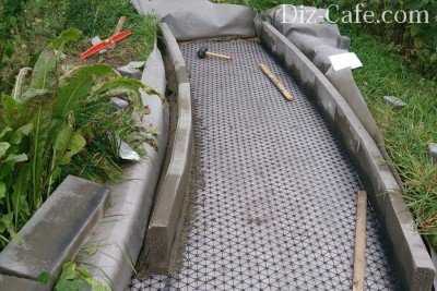 Теперь под выставленные бордюры необходимо застелить геосетку. Чтобы заново не заниматься стыкованием и повторным выставлением бордюров, краской-спреем я наметил их расположение линиями. Затем убрал камни.