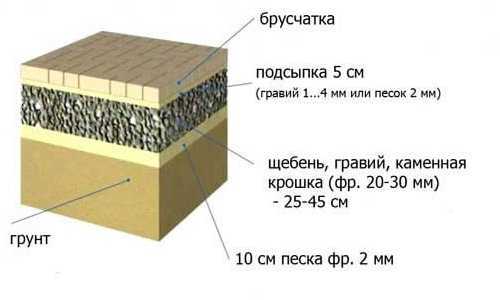 После этого выкладывается гравийно-песчаная подушка, которая предназначена для отвода воды и создания подложки для укладки брусчатки.