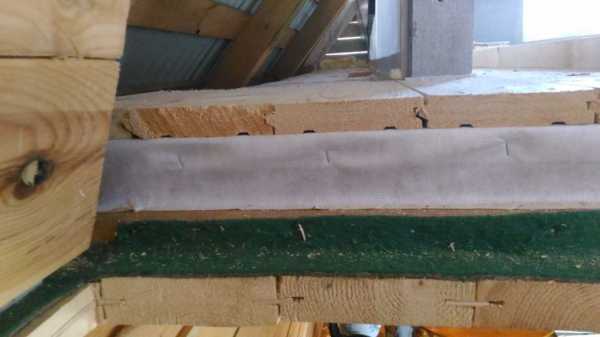 На деревянный настил кладут лаги из бруса с шагом 400 – 500 мм. Перекрытие утепляют.