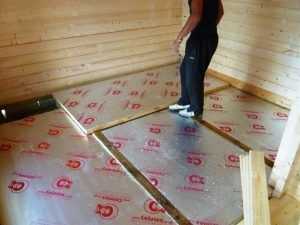 - Для устройства деревянных полов на пароизоляцию устанавливают лаги из деревянного бруса. Утеплитель кладут между лагами.