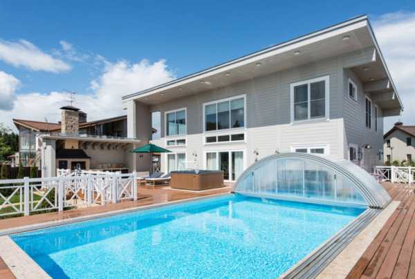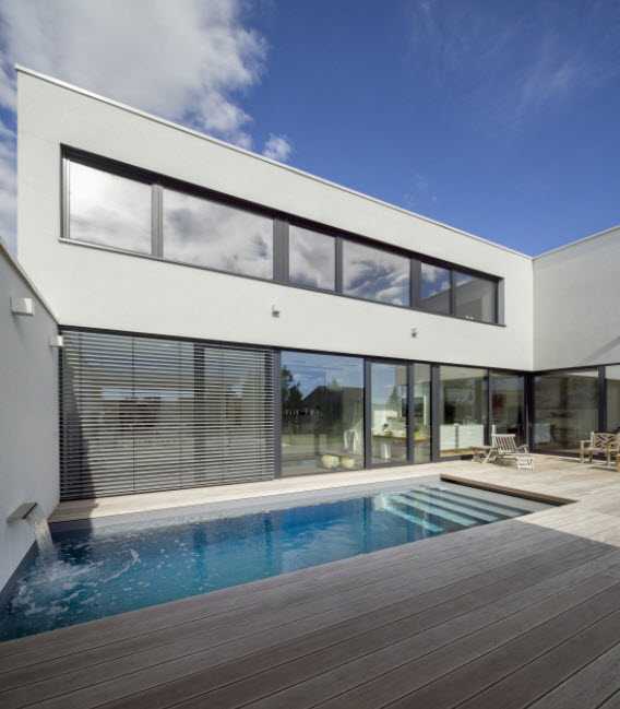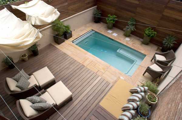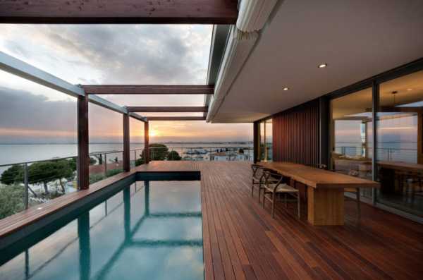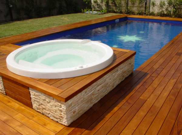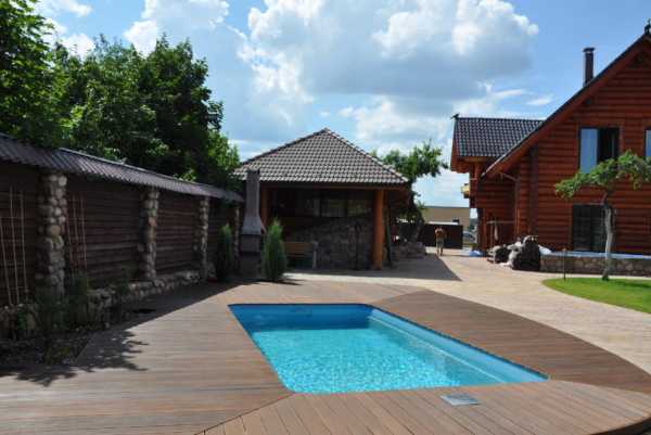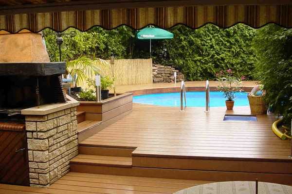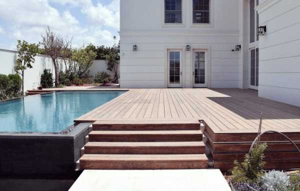 Пол у бассейна можно отделать террасной доской – она не боится влаги.