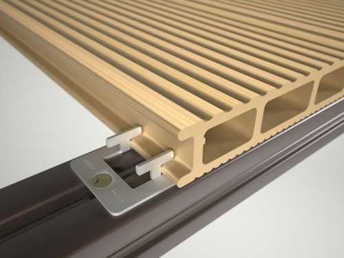 В качестве крепежа применяются саморезы, их предварительно необходимо смазать антикоррозийным составом. Также подготовительной работой станет высверливание отверстий в досках с лицевой части через некоторый промежуток.Если вы решили воспользоваться открытым способом монтажа декинга, то нужно не забывать, что останутся видны головки саморезов. Именно из-за этой причины предпочтение отдают закрытому способу, но для этого потребуются специальные элементы.