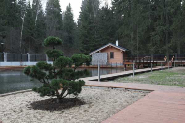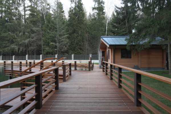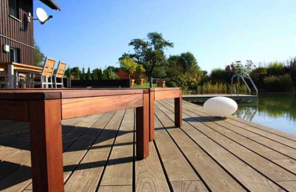 - Террасная доска превосходно зарекомендовала себя на участках повышенной влажности. Поэтому ее активно используют для обустройства территории вокруг бассейна, для отделки бань и саун, пирсов и причалов небольших размеров.