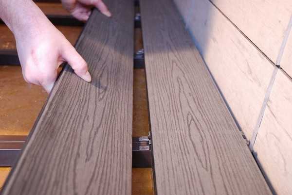 Впоследствии доски состыкуются за счет металлических пластин. Как при открытом способе, здесь также саморезы покрываются антикоррозийным слоем. Далее они прикручиваются к лагам и закрепляются саморезами. При таком раскладе все крепежы будут скрытыми.