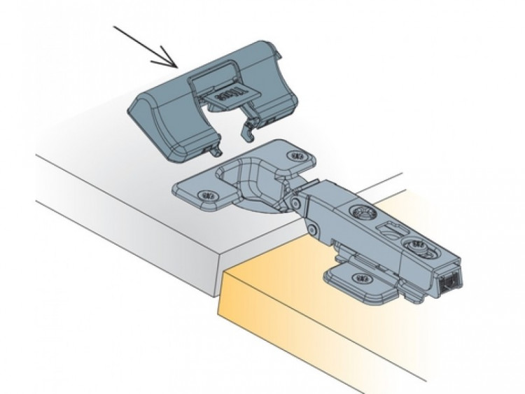 Если дверцу удерживают три навеса, то демпфер можно устанавливать один, сверху либо снизу. Накладные доводчики бывают: