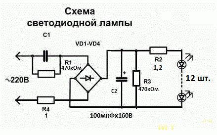 Берём стандартную китайскую лампочку. Вот её схема (немного усовершенствованная). Почему усовершенствованная? Эта схема подойдёт к любой дешёвой китайской лампочке. Отличие будет только в номиналах радиодеталей и отсутствии некоторых сопротивлений (в целях экономии).