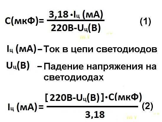 Бывают лампочки с отсутствующим С2 (очень редко, но бывает). В таких лампочках коэффициент пульсаций 100%. Очень редко ставят R4. Хотя сопротивление R4 просто необходимо. Оно будет вместо предохранителя, а также смягчит пусковой ток. Если в схеме отсутствует, лучше поставить. Ток через светодиоды определяет номинал ёмкости С1. В зависимости от того, какой ток мы хотим пропустить через светодиоды (для самодельщиков), можно рассчитать его ёмкость по формуле (1).