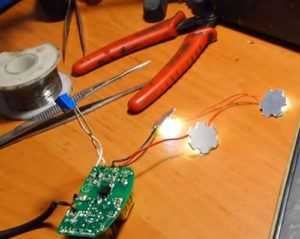 ![]() | Далее находим выход на нагрузку и определив полярность припаиваем светодиоды, заранее собранные последовательно. |