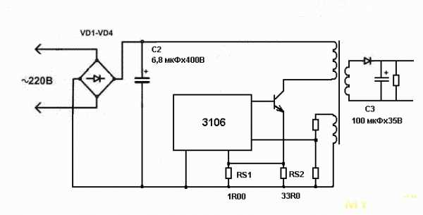 Микросхема 3106 отслеживает выходные параметры преобразователя через обратную связь с вспомогательной обмотки трансформатора и управляет ключевым транзистором. Попытки найти информацию на эту МС в Интернете ничего не дала. RS1 RS2 — токозадающие резисторы. От их номинала зависит выходной ток драйвера. RS1 (1 Ом) – основной, при помощи RS2 (33 Ом) выходной ток подгоняется более точно.