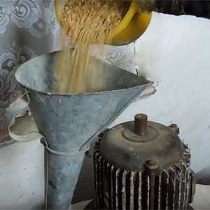 Закрываем задвижку в бункере и засыпаем в него зерно, включаем электродвигатель и понемногу приоткрываем задвижку. Зерно начнёт понемногу просыпаться в рабочую камеру и измельчаться вращающимся ножом.