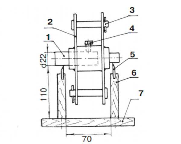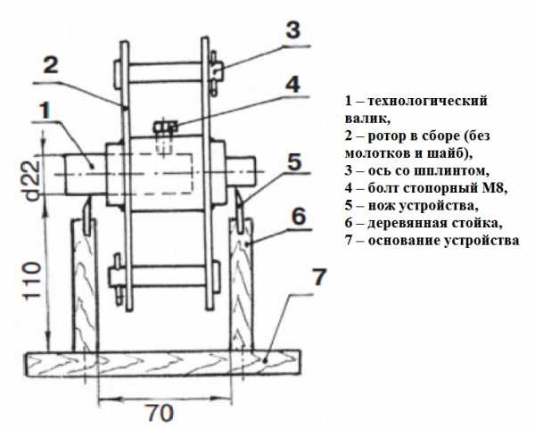 1 – технологического валика, 2 – собранного ротора (не включая молотки и шайбы), 3 – оси и шплинта, 4 – болта стопорного М8, 5 – ножа устройства, 6 – деревянной стойки, 7 – основания.
