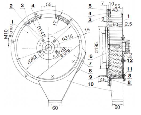 При помощи токарного станка следует произвести обрезку барабана 3 (рис. 1), для обеспечения высоты 65 мм. Внутренняя сторона должна обладать выточкой d = 282 мм, высота которой 3 мм (придется сточить зубцы). Теперь следует отрезать третью часть в барабане, это нужно для отверстия под решето. Оно должно поддерживаться дугами 8, приваренными на фланец 5 и внешнюю сторону в барабане.