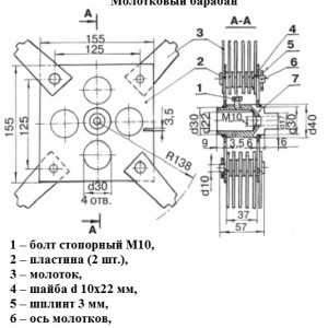 1 – болта стопорного М10, 2 – двух пластин, 3 – молотка, 4 – шайбы (1 на 2,2 см), 5 – шплинта, 6 – оси молотков, 7 – вала в барабане