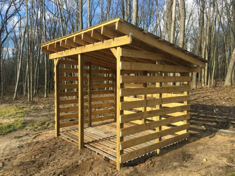 Дровенник на даче строят со стенками из решеток или оставляют щели. Деревянные доски нужно забивать под углом. Таким образом, снег не будет попадать вовнутрь постройки. Размер щелей должен быть примерно 3-9 см. Если вы живете в регионе, где возможны обильные и частые снегопады, слишком больших и широких досок следует избегать. Конструкцию можно превратить в сарай, приделав к нему дверь. Более того, благодаря ней вы сможете обезопасить свой дровник от воров.