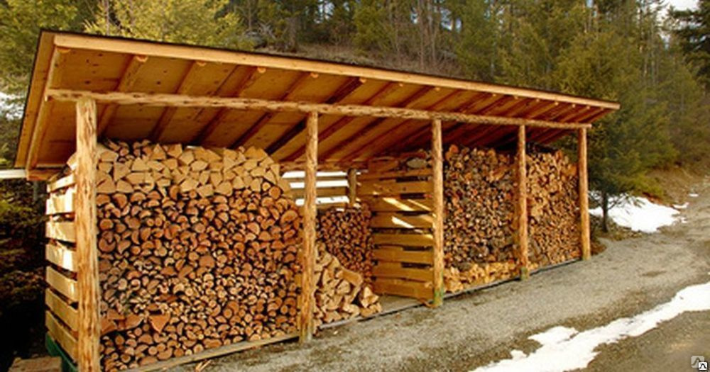 Пластина из железа должна быть больше дровника по размеру. Крыша – большого размера, чтобы хорошо отводить влагу. - Отдельный дровник. Такая пристройка может быть открытой. Дрова будут сохнуть под солнцем. Устанавливайте конструкцию с северной стороны, для лучшего продувания ветром.