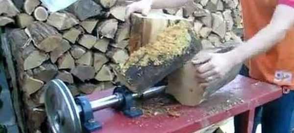 Оснастку следует устанавливать на вал электрического двигателя или редуктора, который медленно вращается, со скоростью 80-100 оборотов в минуту. В результате древесина ввинчивается и раскалывается. Основное преимущество такого устройства представлено отсутствием упора и безопасностью работника.
