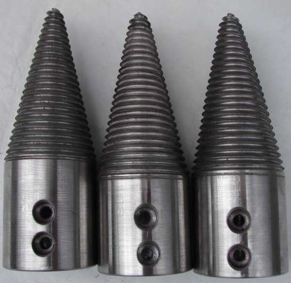 - Конусный рабочий инструмент (колун), который часто называют морковкой из-за его внешнего вида. На детали при помощи токарного станка нарезается упорная резьба, благодаря которой морковка вкручивается в полено и разрывает его.