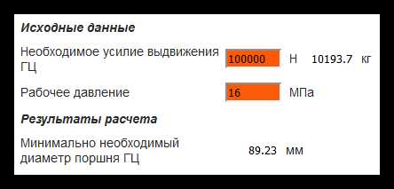 ΠΠ²ΠΎΠ΄ΠΈΠΌ Π² ΠΏΠΎΠ»Π΅ «ΠΠ΅ΠΎΠ±Ρ ΠΎΠ΄ΠΈΠΌΠΎΠ΅ ΡΡΠΈΠ»ΠΈΠ΅…» Π·Π½Π°ΡΠ΅Π½ΠΈΠ΅ 100 000 , Π° Π² ΠΏΠΎΠ»Π΅ «Π Π°Π±ΠΎΡΠ΅Π΅ Π΄Π°Π²Π»Π΅Π½ΠΈΠ΅» Π·Π½Π°ΡΠ΅Π½ΠΈΠ΅ 16 . ΠΠ΄Π΅ΡΡ Π½ΡΠΆΠ½ΠΎ Π·Π°ΠΌΠ΅ΡΠΈΡΡ, ΡΡΠΎ Π±ΠΎΠ»ΡΡΠΈΠ½ΡΡΠ²ΠΎ ΡΡΠ°Π½Π΄Π°ΡΡΠ½ΡΡ Π³ΠΈΠ΄ΡΠΎΡΠΈΠ»ΠΈΠ½Π΄ΡΠΎΠ² ΠΈΠΌΠ΅ΡΡ ΡΠ°Π±ΠΎΡΠ΅Π΅ Π΄Π°Π²Π»Π΅Π½ΠΈΠ΅ 16 ΠΌΠΠ°, ΠΏΠΎΡΡΠΎΠΌΡ Π²Π²ΠΎΠ΄ΠΈΠΌ ΠΈΠΌΠ΅Π½Π½ΠΎ ΡΡΠΎ Π·Π½Π°ΡΠ΅Π½ΠΈΠ΅. ΠΠΎΠ»ΡΡΠ°Π΅ΠΌ ΡΠ΅Π·ΡΠ»ΡΡΠ°Ρ: Π½Π΅ΠΎΠ±Ρ ΠΎΠ΄ΠΈΠΌ Π³ΠΈΠ΄ΡΠΎΡΠΈΠ»ΠΈΠ½Π΄Ρ Ρ ΠΏΠΎΡΡΠ½Π΅ΠΌ Π΄ΠΈΠ°ΠΌΠ΅ΡΡΠΎΠΌ 89,2 ΠΌΠΌ. ΠΠΊΡΡΠ³Π»ΡΠ΅ΠΌ Π² Π±ΠΎΠ»ΡΡΡΡ ΡΡΠΎΡΠΎΠ½Ρ Π΄ΠΎ 90ΠΌΠΌ.