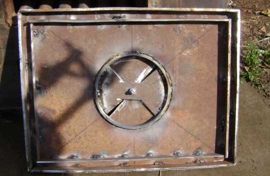Снизу корпуса вырежьте отверстие для очистки котла от продуктов сгорания дров.