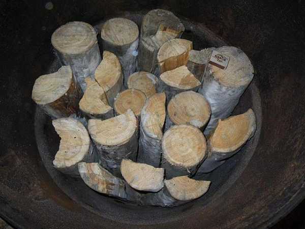 - Через топочное отверстие в корпус закладываются крупные дрова, промежутки между которыми заполняются опилками, щепой или горючим мусором. С учётом того, что горение начинается снизу можно использовать дрова с повышенной влажностью. Пока огонь тлеет они успеют просохнуть.