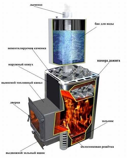 В случае если дровяные агрегаты (традиционные или пиролизные) предназначены также для нагрева воды в банях и саунах в конструкцию включается изогнутая труба, подключаемая к водопроводной системе, или водяной бак, через которую проходит дымоход с горячим воздухом.