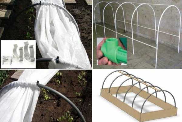 Парники из пластмассовых дуг, например, парник Подснежник, предусматривают использование ПВХ трубы (3,6 м) и другие материалы