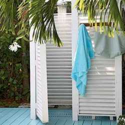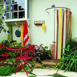 - Чтобы можно было использовать душ в прохладную погоду, оборудуйте его подогревом. Для этого предусмотрите установку бака с электрическим водонагревателем. Как вариант, кабинку можно пристроить к дому и провести к ней горячую воду из электрического бойлера. На крайний случай, если у вас достаточно места, оборудуйте душ с подогревом в доме. Здесь вы сможете купаться в любую погоду.