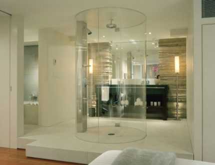 Душ открытого типа не имеет задних стенок, поэтому располагается он в углу комнаты.