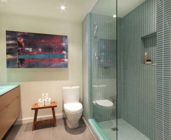 Если такой вариант покажется простоватым, следует внести изюминку при помощи цвета. Стеклянные перегородки для душевой рекомендуется выбрать одного оттенка, а дверцы – другого. Можно нанести рисунок на определенные зоны.