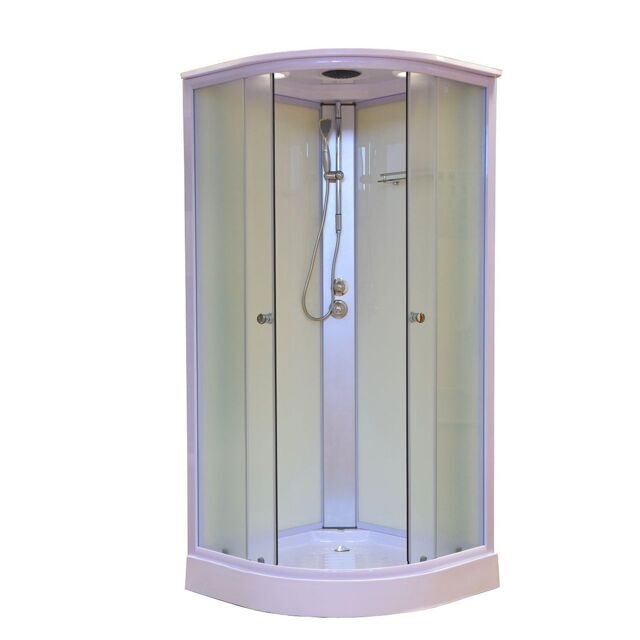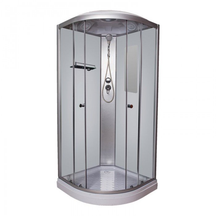 Передняя стенка и дверцы выполнены из прозрачного стекла, задняя стенка – из тонированного, поддон изготовлен из АБС-пластика. Кабина оснащена душевым гарнитуром, тропическим душем, гидромассажной системой, есть радио и вентиляция. Также в комплектацию входит сифон, зеркало, регулируемый каркас и полки