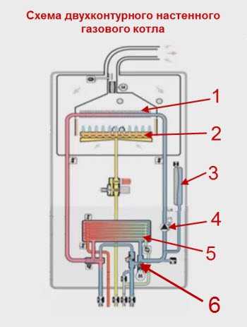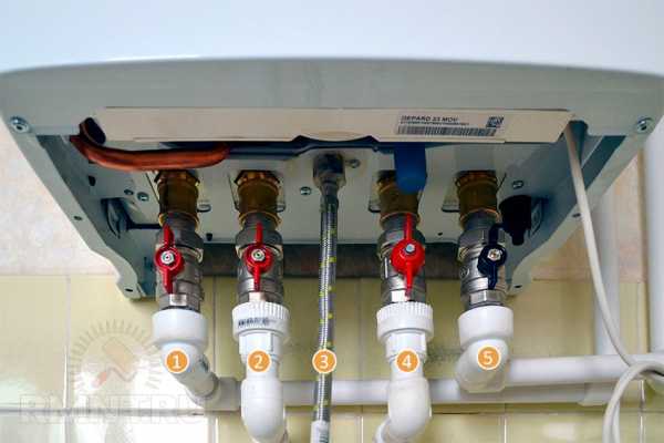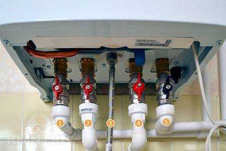 1. Подача отопления. 2. Горячая вода для бытовых нужд. 3. Газ. 4. Холодная вода к контуру ГВС. 5. Обратка отопления