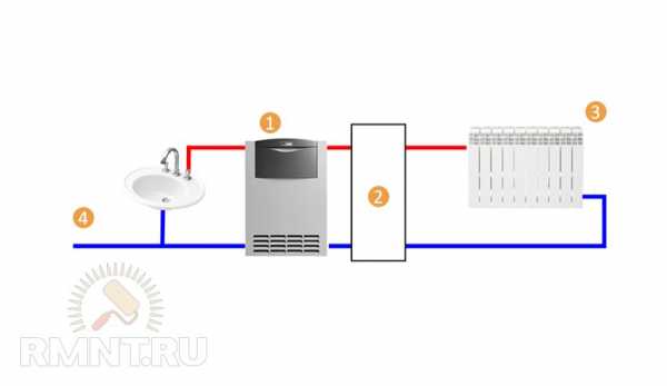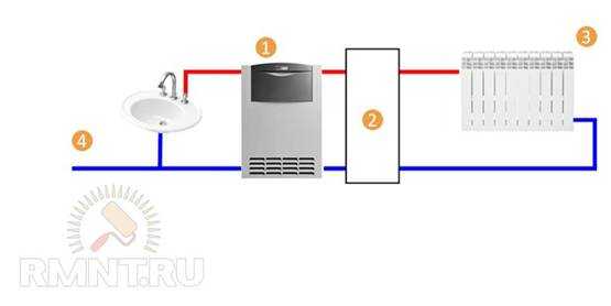 Подключение двухконтурного котла: 1. Котел. 2. Обвязка котла отопления. 3. Отопительный контур. 4. Ввод холодной воды