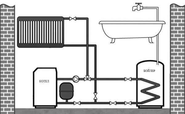 Важно! Такая схема надежнее, однако цена котла с бойлером будет ощутимо выше, чем стоимость одного двухконтурного агрегата. В этом и состоит главное отличие, кроме того, для установки бойлера понадобится дополнительное место.