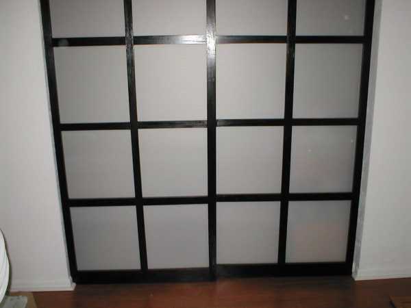 В середине двери можно сделать практически любой рисунок. Я выбирал рисунок так, чтобы он напоминал японскую ширму «Шоджи» (shoji) которая была у нас в спальне. Для заполнения использовался обычный сотовый поликарбонат. Сейчас он продается практически в любом строительном гипермаркете. Этот материал пропускает свет, но при этом он не так прозрачен, чтобы были видны ваши вещи в шкафу. По сравнению с обычным стеклом, сотовый поликарбонат очень легок, прост в работе и отлично выглядит, особенно если сделать внутреннюю подсветку.