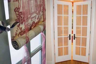 Межкомнатная перегородка- Рулонные шторы могут дополнить стеклянные или пластиковые двери между комнатами, декорируя их и по необходимости защищая от лишних глаз. В таком случае монтаж занавески производится на саму дверь.