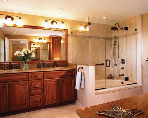Вишневое дерево туалетного столика и большие стекла душевой с классическими элементами