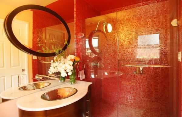 Яркая и живая ванная использует красную плитку и стеклянные душевые двери для создания азиатского стиля (Susan Diana Harris Interior Design)