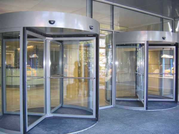 Револьверные или вращающиеся дверные блоки являются достаточно популярным и востребованным вариантом для установки в местах высокой интенсивности движения людей. Такие конструкции оборудуются приспособлениями для блокирования или разблокирования дверей. Кроме того, возможна комплектация специальным устройством ограничения доступа. Следует отметить, что использование револьверных алюминиевых дверей требует установки дополнительных распашных конструкций.