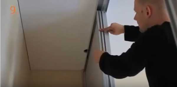 Потом полотно снимается. Точно по отмеченным местам, крепят нижнюю рельсу. Можно использовать двусторонний скотч или шурупы.