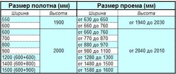 - если она имеет высоту 2 метра, то ширина таких проемов может иметь следующие величины: 90, 80, 70 и 60 см.
